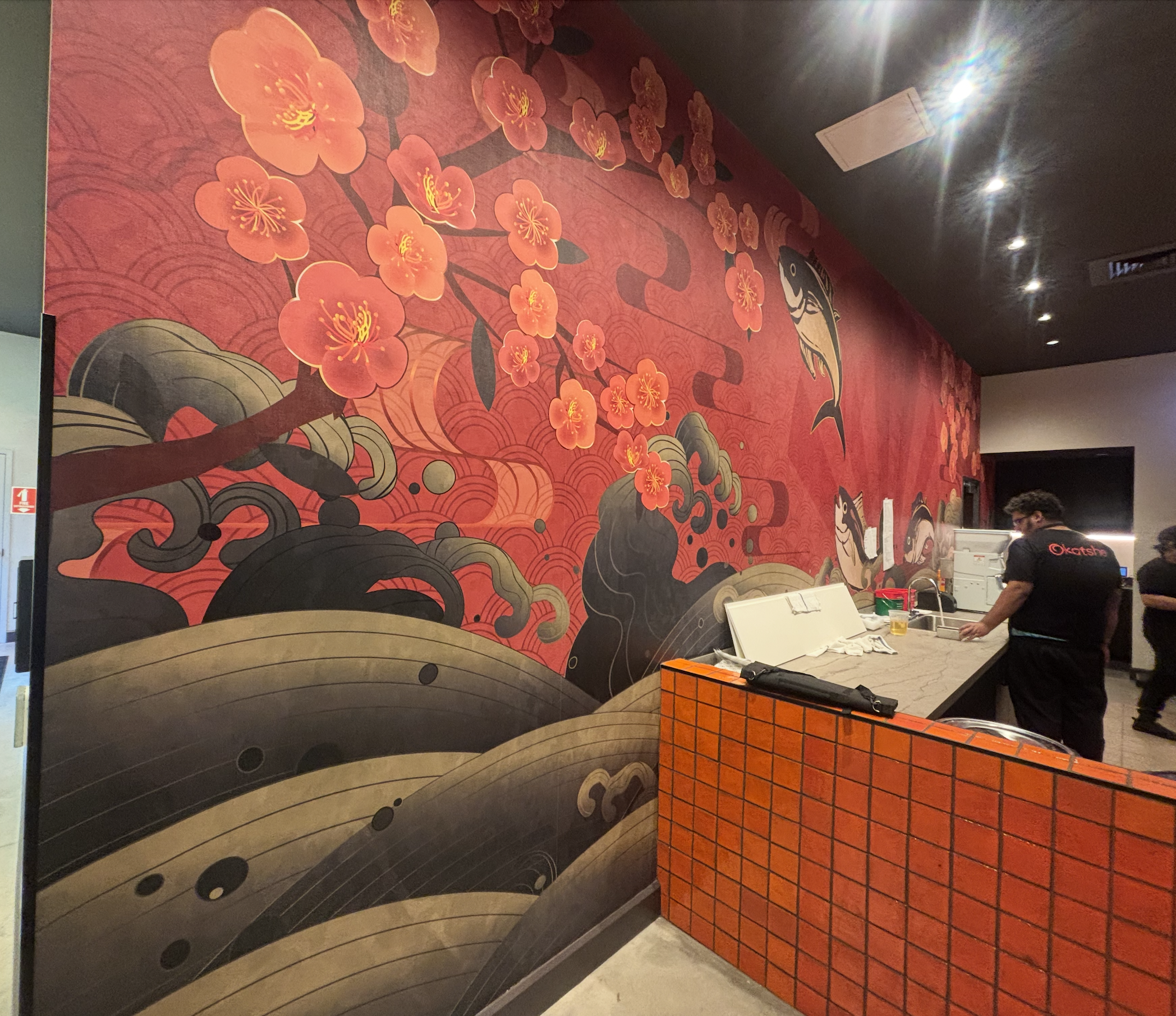 The featured back mural incorporates traditional Japanese patterns, Japan’s national flower the sakura or cherry blossom and dynamic imagery of tuna leaping from the ocean, complementing the paper lanterns above the sushi bar and serving as a central focal point.